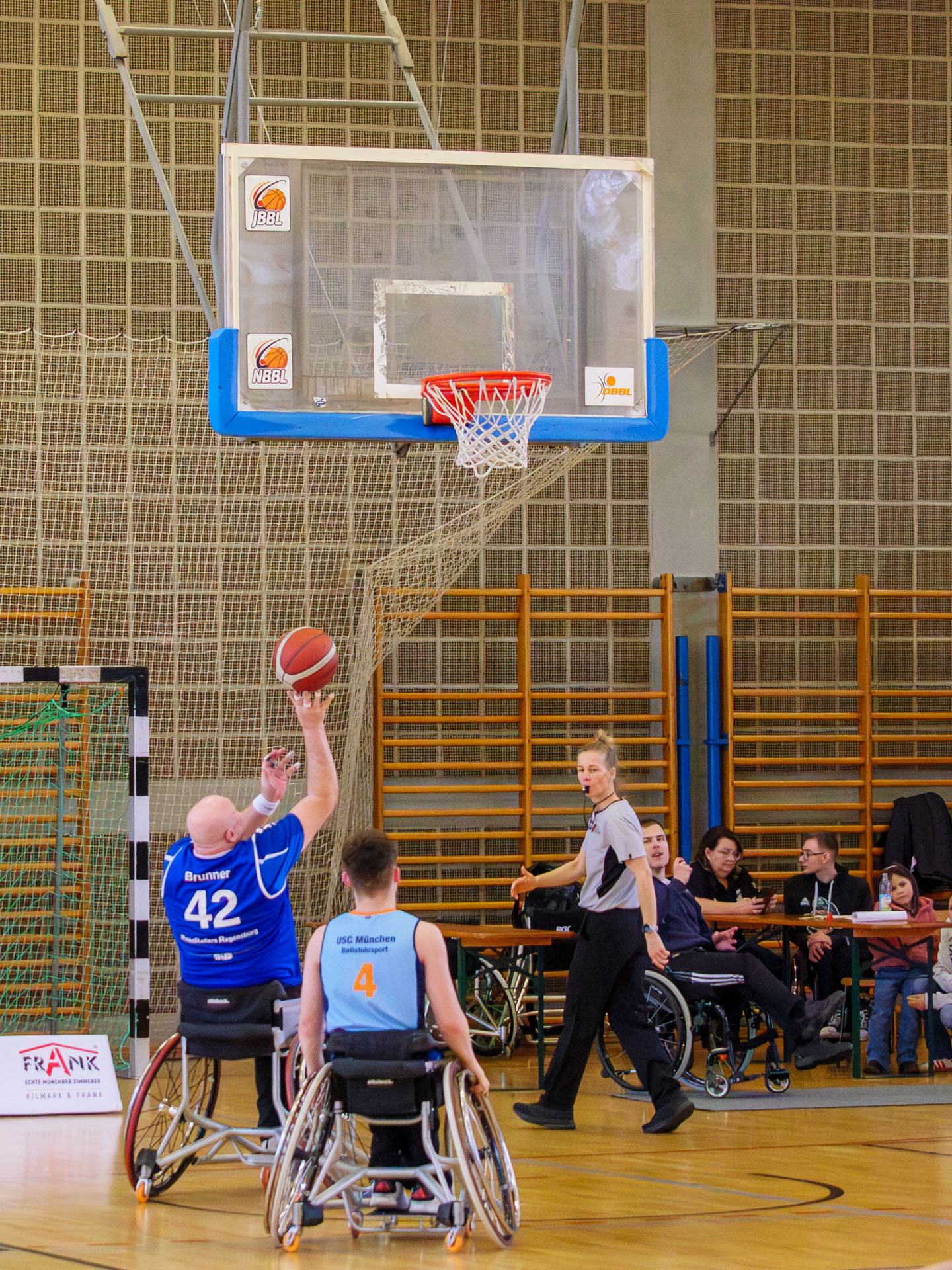 Die Regensburger mussten an diesem Spieltag auf ihren Topscorer Paul Mekelburg verzichten und waren durch weitere krankheitsbedingte Ausfälle nur mit einer sehr dezimierten Mannschaft unterwegs. Da auch noch ein Ersatzspieler im Stau auf der A9 stecken blieb, musste das erste Spiel gegen den USC München 3 ohne Wechselmöglichkeit begonnen werden. Im klassischen Set Play konnten die Regensburger ihren Centerspieler Charly Brunner immer wieder in gute Wurfpositionen bringen, der in bester Trefferlaune erfolgreich punktete. Das erste Viertel ging mit 14:6 klar an die Oberpfälzer. Das Anschlussviertel konnten die Münchner über einige Treffer aus der Distanz ausgeglichener gestalten und bei einem Spielstand von 24:15 wurden die Seiten gewechselt. Das Spiel über den Center funktionierte weiterhin trefflich und mit erneuten acht Punkten von Brunner war zum Ende der dritten Viertels mit 38:21 bereits eine Vorentscheidung gefallen. Zum letzten Viertel war dann auch Spieler Thorsten Altmann in der Halle und das Team der SG BeNi Regensburg hatte die Möglichkeit zu Spielerwechseln. Spielertrainer Ludwig Wolf war mit der Leistung und dem 48:35-Sieg der Mannschaft sehr zufrieden. Lediglich die schlechte Trefferquote von der Freiwurflinie bedarf zusätzlicher Trainingseinheiten.